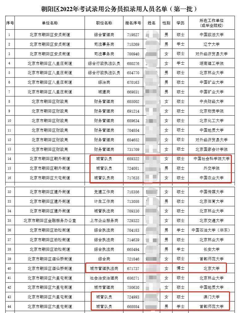 从官方发布的信息来看,这次招考拟录用的学子,整体上呈现名校毕业、高学历的特点。在拟录用人员名单中,除了北京大学毕业生,还有中国社会科学院大学、英国曼彻斯特大学、外交学院等名校毕业生。其中,硕士、博士占了三分之二,拟录取岗位大多是政府部门及街道的城管、党群工作等基层岗位。