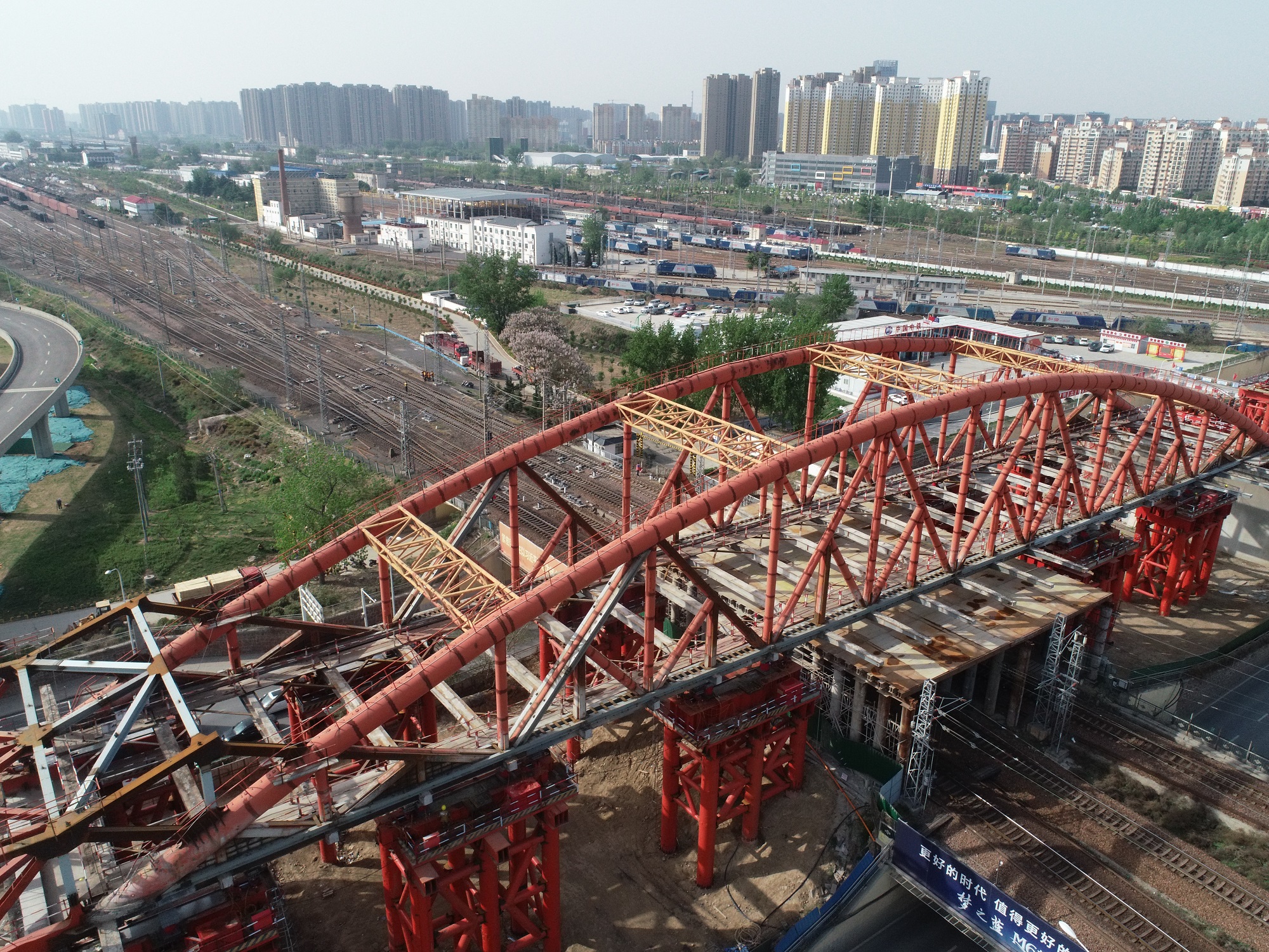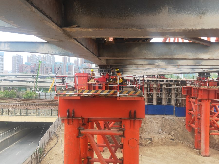此次东侧122米跨钢桁拱纵移拆除采用国内首例“步履机+带顶力滑块”式节点顶推方案,全程不影响“彩虹桥”下方郑州北编组站列车的正常运行。钢桁拱重达2488.6吨,在24台1000吨千斤顶的竖向支撑及24台250吨步履式顶推设备水平推力下,由东向西纵移124.1米至横移位置,最后运用横移系统横移(含导梁)至北侧拆桥平台进行拆解。