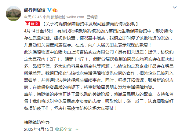 梅陇镇保障物资中部分猪肉存质量问题,上海闵行发布情况说明