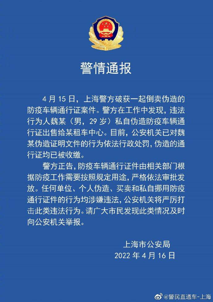 上海市公安局发布通报称:4月15日,上海警方破获一起倒卖伪造的防疫车辆通行证案件。警方在工作中发现,违法行为人魏某(男,29岁)私自伪造防疫车辆通行证出售给某租车中心。