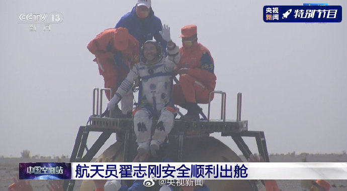 在医监医保人员的帮助下,翟志刚首先出舱,坐上地面人员为其准备的航天员专用座椅。他面带微笑,表示感觉非常良好,并向祖国和人民报告,圆满完成任务。