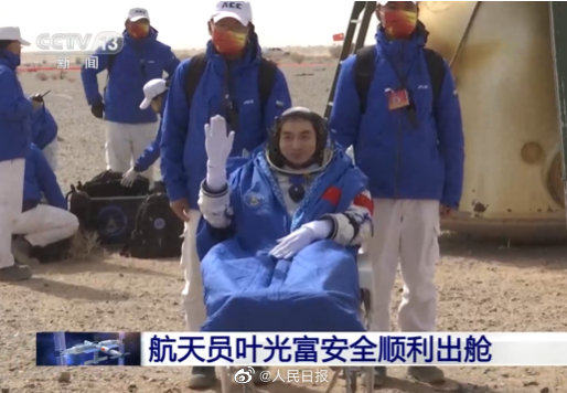 首次飞天的叶光富最后出舱,面对人群做了个“点赞”“比心”的手势。他在接受采访时表示:实现了飞天梦想,可以自豪地向祖国报到!