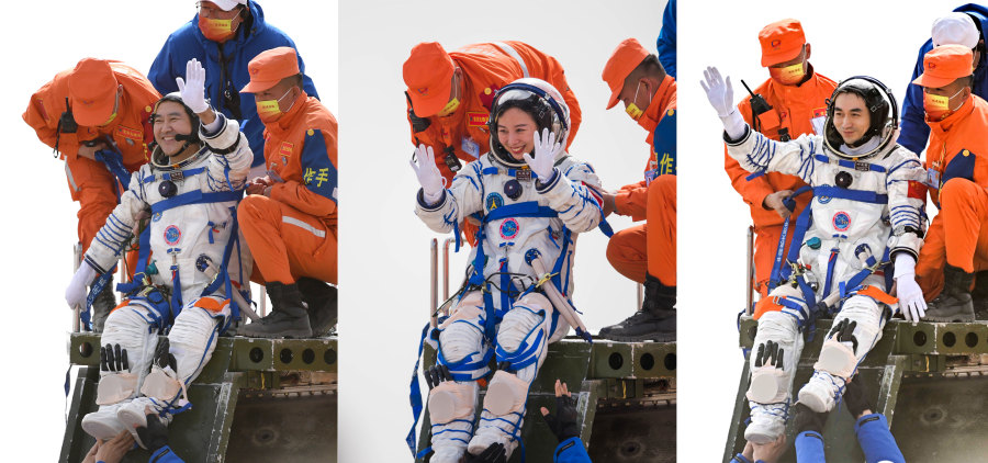 北京时间4月16日9时56分,神舟十三号载人飞船返回舱在东风着陆场成功着陆。在空间站执行飞行任务半年之久的航天员翟志刚、王亚平、叶光富安全顺利出舱,向迎接他们的人群挥手致意。