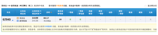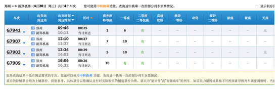 与此同时,郑州站到新郑机场的车次有:G7941、G7907、G7903、G7909;郑州东至新郑机场的车次只有G7945。也查不到以C开头的郑机城际列车信息。