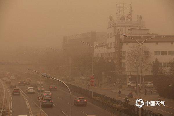 △ 2021年3月15日,近10年来最强沙尘过程侵袭北京,天空昏黄一片。(图/中国天气网 王晓)
