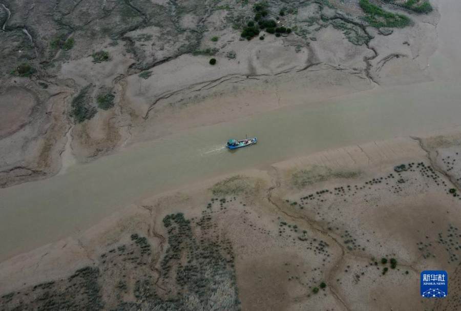 一艘渔船在闽江河口湿地浅滩里穿行(4月19日摄,无人机照片)。新华社记者 魏培全 摄