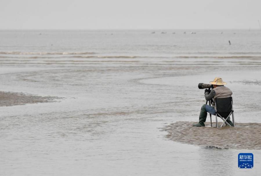 在闽江河口湿地,一名鸟类摄影爱好者在拍摄水鸟(4月19日摄)。新华社记者 魏培全 摄