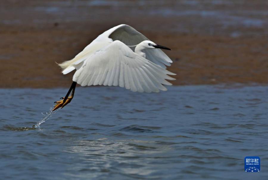 一只白鹭在湿地里飞翔(4月21日摄)。新华社记者 魏培全 摄
