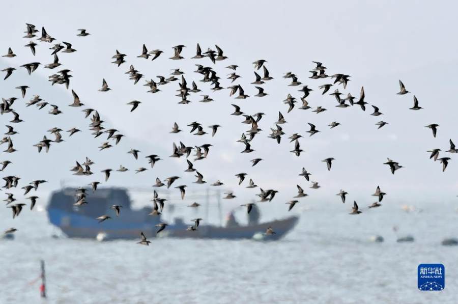 在闽江河口湿地,天空中的鸟群与远处作业的渔船相映成画(4月10日摄)。新华社记者 魏培全 摄