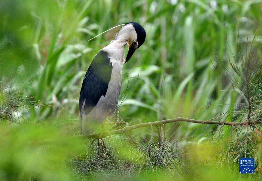 在闽江河口湿地,一只夜鹭在草丛里梳理羽毛(4月21日摄)。新华社记者 魏培全 摄
