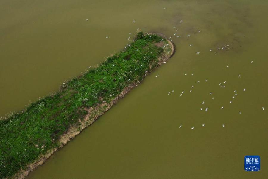 一群水鸟在闽江河口湿地里穿梭飞行(4月21日摄,无人机照片)。新华社记者 魏培全 摄