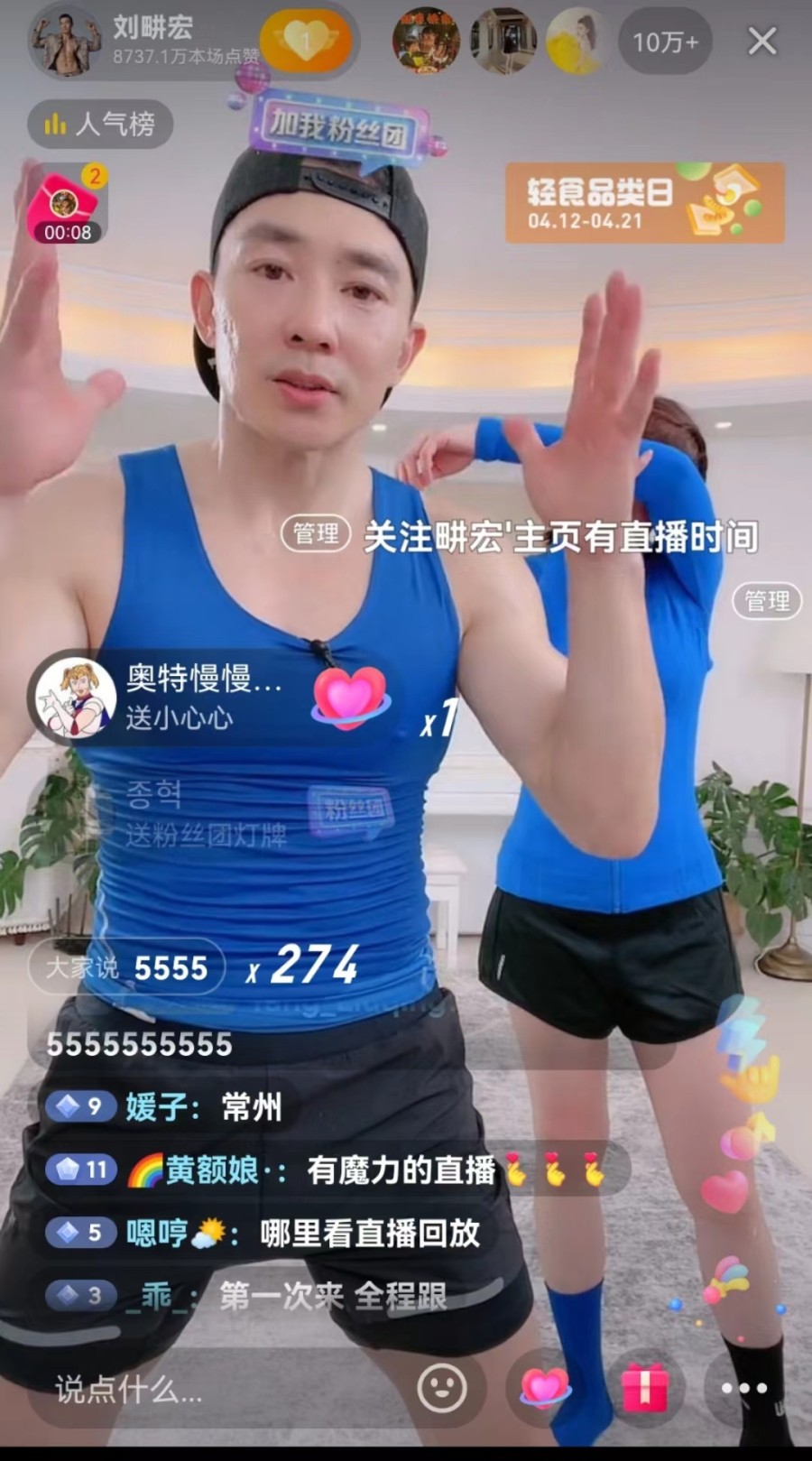 得知自己粉丝超过2000万时,刘畊宏直言:“感谢你们来到直播间和我们一起练,能把正能量传递给大家,把健康快乐献给大家,更要感谢助教我老婆!”