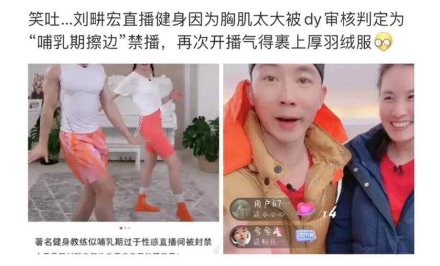 一开始,刘畊宏因为穿健身背心还大汗淋漓,常常被直播平台判定为“打擦边球”。夫妻俩没办法,只好在直播时备上羽绒服,平台一提示,就立马穿上。