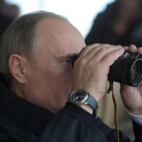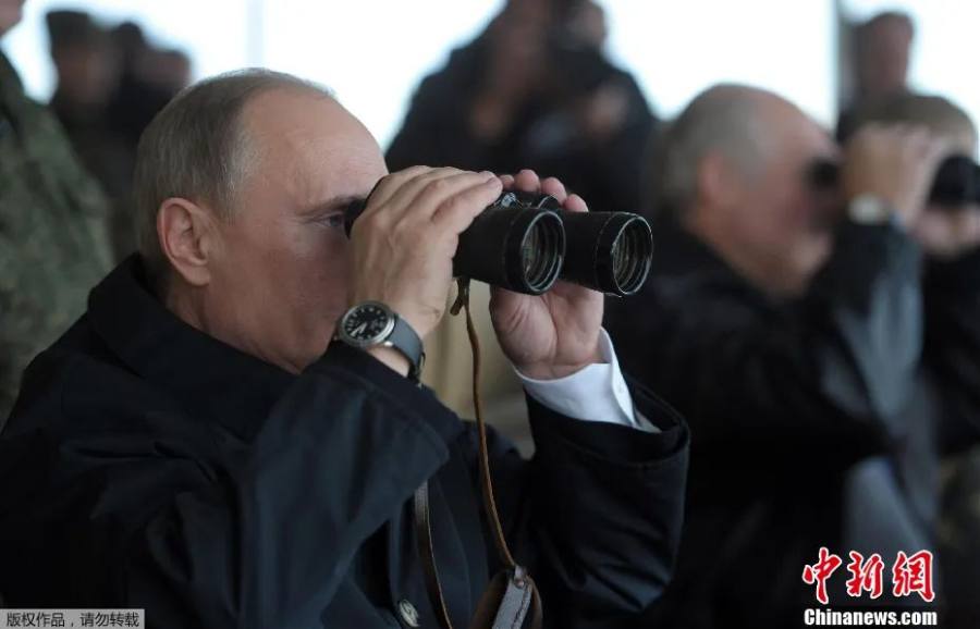 资料图:俄总统普京用望远镜观看军演。
