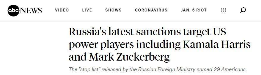 21日,俄外交部宣布,对29名为“反俄议程”服务的美国人士等实施制裁。美国媒体很快让这事上了大头条——俄制裁名单中包括美副总统哈里斯和脸书创始人扎克伯格。