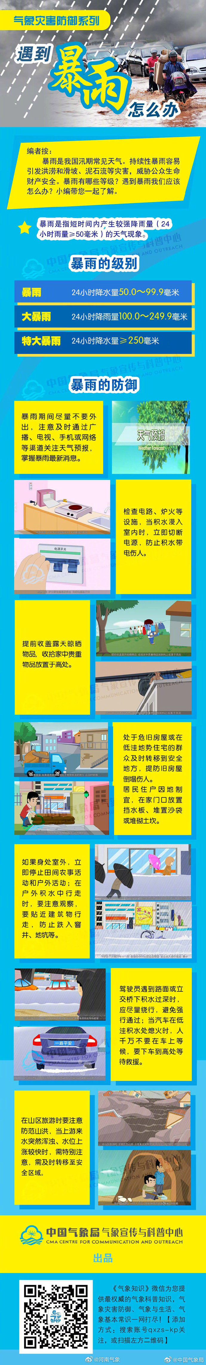 黄河以南大部有小到中雨,其中中南部有大到暴雨(50~90mm),局部大暴雨(100~180mm)。