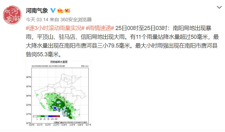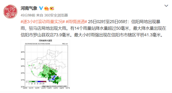 据@河南气象,截止到25日05时,南阳、信阳局地已出现大暴雨。