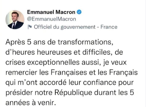 据央视新闻报道,当地时间4月24日晚,法国总统马克龙胜选后,在其个人社交媒体上表示,在过去五年,法国经历了种种变革,有欢乐的时光,也有艰难的时刻,以及前所未有的危机。他感谢法国人民对他的信任,信任他在接下来的五年中继续领导法国。