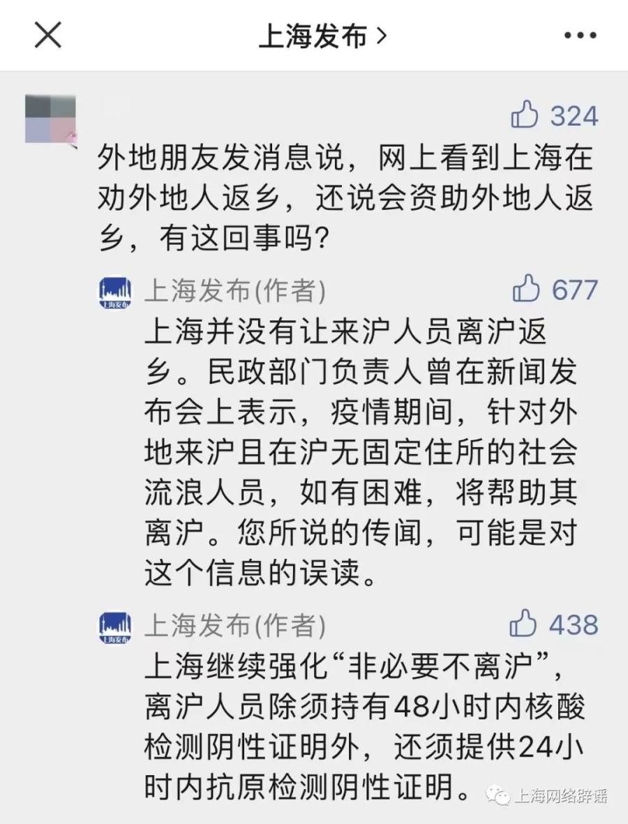 对此,上海发布回答:上海并没有让来沪人员离沪返乡。民政部门负责人曾在新闻发布会上表示,疫情期间,针对外地来沪且在沪无固定住所的社会流浪人员,如有困难,将帮助其离沪。