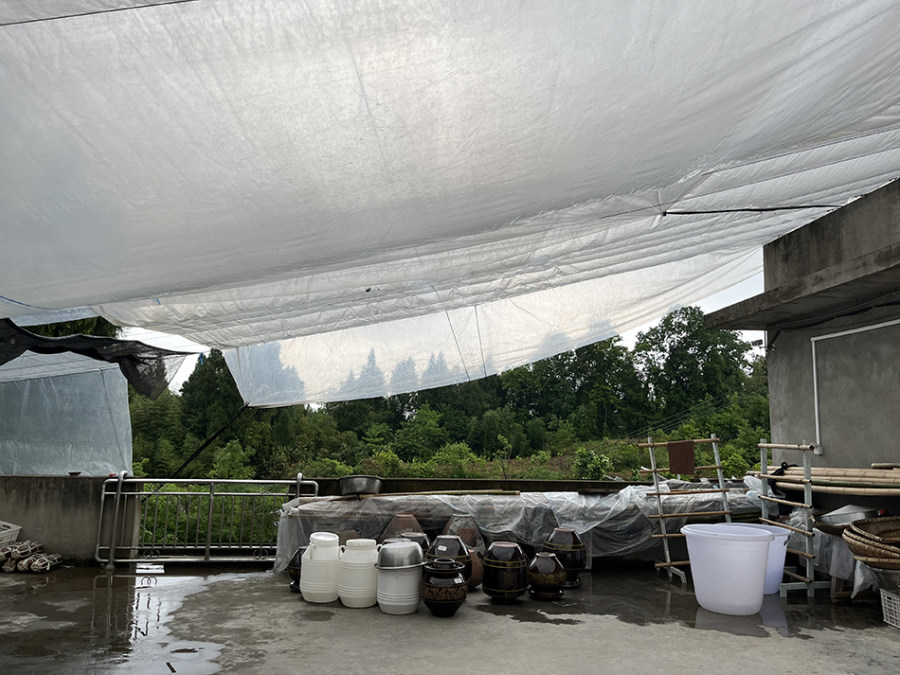 这是一幢两层的建筑,一楼为仓储和打包发货的地方,墙上张贴着重庆市万州食品药品检验所出具的发酵酱测试报告、万州食品药品检验所出具的豆豉检验报告、营业执照等复印文件;二楼为食品加工和存储的地方。澎湃新闻看到,“毛妈妈经营部”地方不大,环境卫生比较干净。