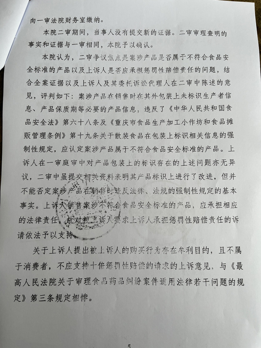 重庆市一中院于2022年4月7日作出的判决书显示,该院二审期间,当事人没有提交新的证据,二审审理查明的事实和证据与一审相同,该院予以确认。该院认为,二审争议焦点是案涉产品是否属于不符合食品安全标准的产品及“毛妈妈经营部”是否应承担惩罚性赔偿责任的问题。案涉产品在销售时,其外包装上未标识生产者信息、产品保质期等必要的产品信息,违反了强制性规定,应认定案涉产品属于不符合食品安全标准的产品。“毛妈妈经营部”在一审中对产品包装上的标识存在的上述问题亦无异议,二审中虽提交相关资料表明其产品标识上进行了改进,但并不能否认案涉产品在销售时违反法律、法规的强制性规定的基本事实。“毛妈妈经营部”销售案涉不符合食品安全标准的产品,应承担相应的法律责任。故对邵佰春要求“毛妈妈经营部”承担惩罚性赔偿责任的诉请予以支持。
