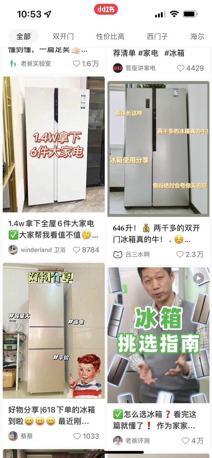 在小红书平台,多位博主精心整理了爆款冰箱“种草合集”。从容积、性能到外观、噪音,将多种数据铺开做分析,点赞量多的内容高达上万。很多受众群体被“种草”后表示:“马上就去换”,也有受众在评论区抱怨,“这款缺货了,还不知道啥时候有货”。