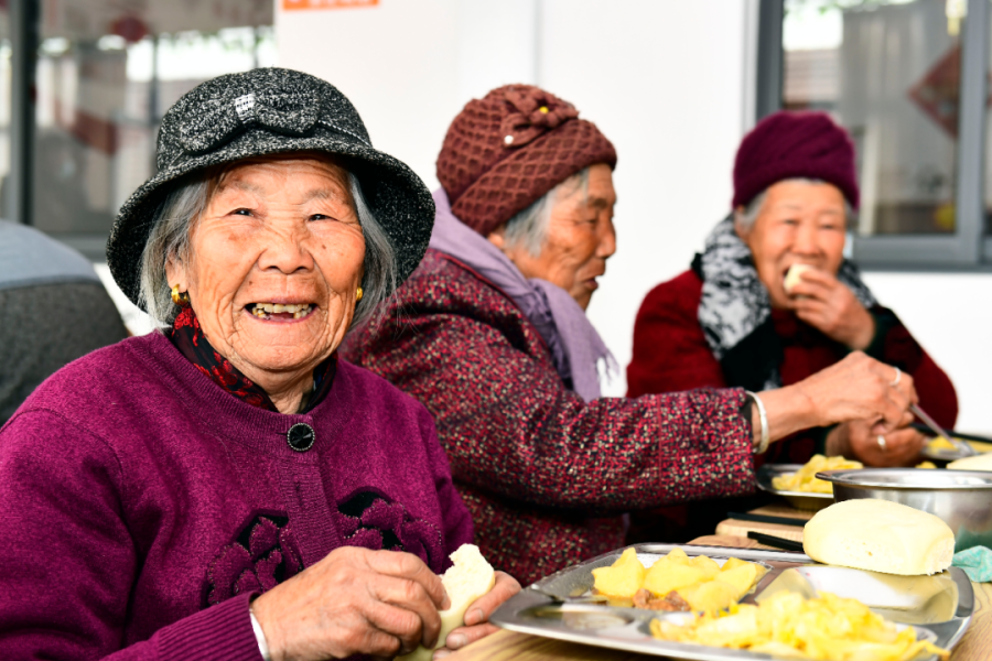 2022年2月27日,在山东日照市岚山区虎山镇黄家峪村养老服务中心,老人在吃午餐。新华社记者 郭绪雷 摄