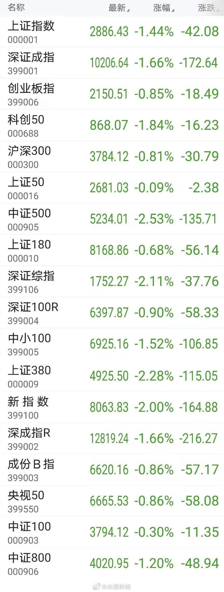 至4月26日收盘,上证综指跌1.44%,报2886.43点;科创50指数跌1.84%,报868.07点;深证成指跌1.66%,报10206.64点;创业板指跌0.85%,报2150.51点。