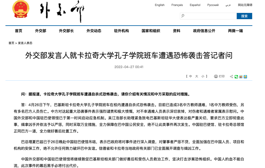 问:据报道,卡拉奇大学孔子学院班车遭遇自杀式恐怖袭击,请你介绍有关情况和中方采取的应对措施。