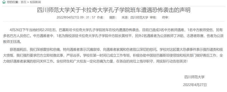 4月26日下午当地时间2:20左右,巴基斯坦卡拉奇大学孔子学院班车在校内遭遇恐怖袭击,目前已造成3名中方教师遇难,1名中方教师受伤,另有多名巴方人员伤亡。中方遇难者中,1名为我校派驻卡拉奇大学孔子学院中方院长黄桂平,另外2名遇难者为公派教师丁沐舫、志愿者陈赛,伤者为公派教师王钰清。