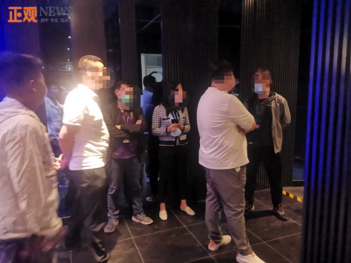 21时30分,消防门打开,执法人员进入,凤凰台派出所民警也到达现场,与执法人员展开现场检查。