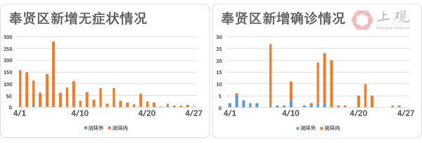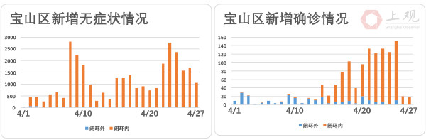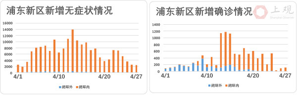 4月27日,在上海新增的1292例确诊病例中,432例为闭环内确诊,仅有2例病例是在闭环外确诊,占比仅为0.155%。而剩余858人为此前无症状患者转为确诊病例。