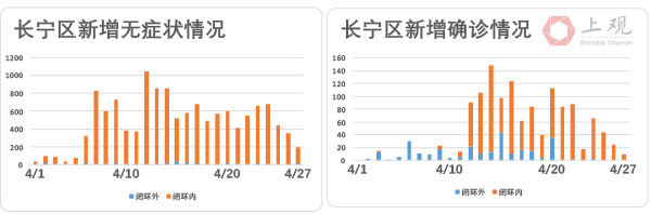 徐汇区无症状感染者数也不断下降,相比4月23日,27日新增病例数降幅达到79.1%。
