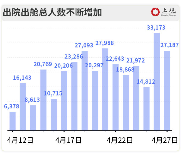 从4月18日起,当日出院出舱总人数已超过当日新增病例数,4月26日,出院出舱总人数达到33173人,比当日新增人数多出19611人。