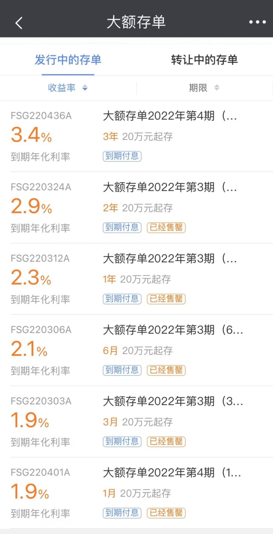 记者通过银行网点实地走访、App查询等方式了解到,在售大额存单中很难见到年利率在3.5%以上的产品。不少银行1年期、2年期、3年期的大额存单额度较为紧张,甚至部分已售罄。