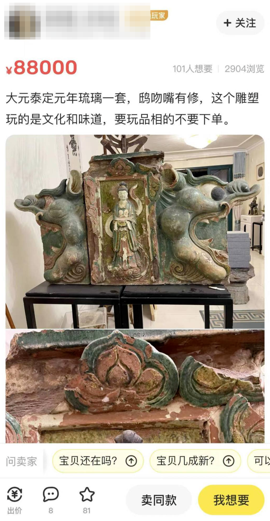 闲鱼上售卖的疑似福源院西配殿的琉璃脊饰(经修补)