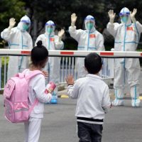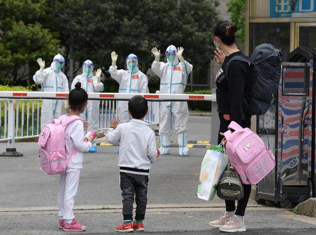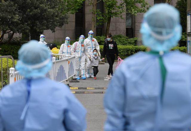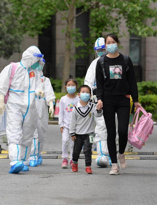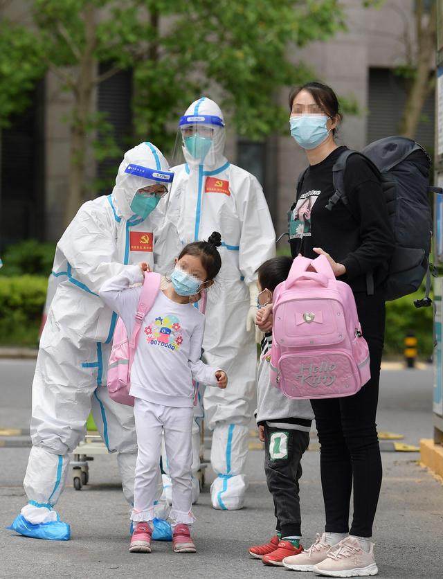 ↑4月30日,在医护人员的陪伴下,妈妈领着小华(前中)和姐姐(后中)从上海交通大学医学院附属仁济医院南部院区的收治点内走出,准备回家。