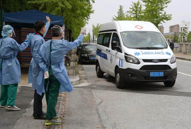 ↑4月30日,医护人员在医院出口向乘车返家的三人挥手道别。