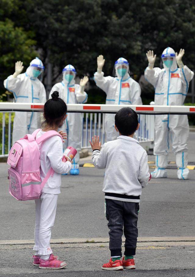 ↑4月30日,走出医院准备回家时,小华(右)和姐姐回身向护送他们出院的医护人员挥手道别。
