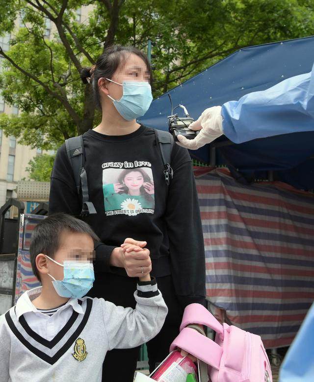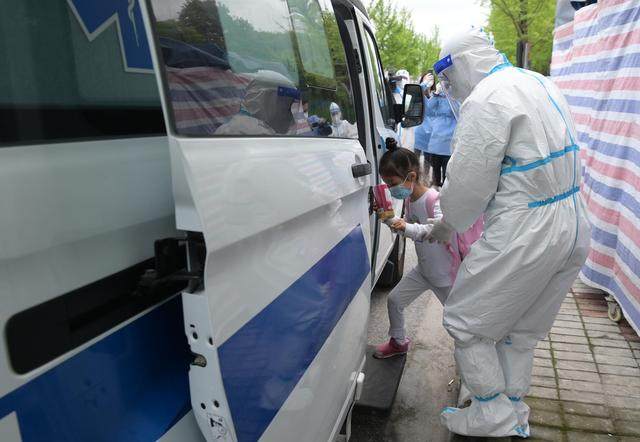↑4月30日,在医护人员的陪伴下,妈妈领着小华(中)从上海交通大学医学院附属仁济医院南部院区的收治点内走出。