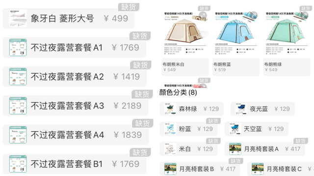 近日,一户外品牌旗舰店中,帐篷、天幕、户外椅、户外垫等一系列露营装备都被打上灰色的“缺货”标签。