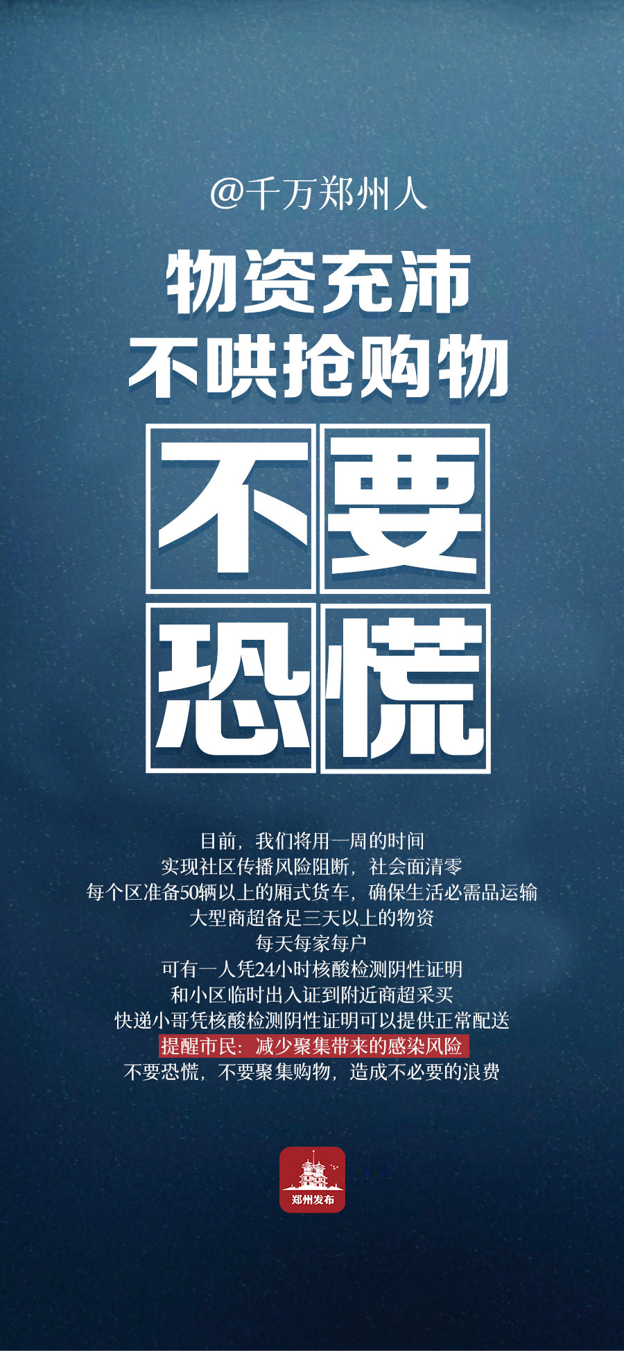 @千万郑州人,重要提醒:物资充沛且可以每天外出采买,不囤积物资,不必恐慌!