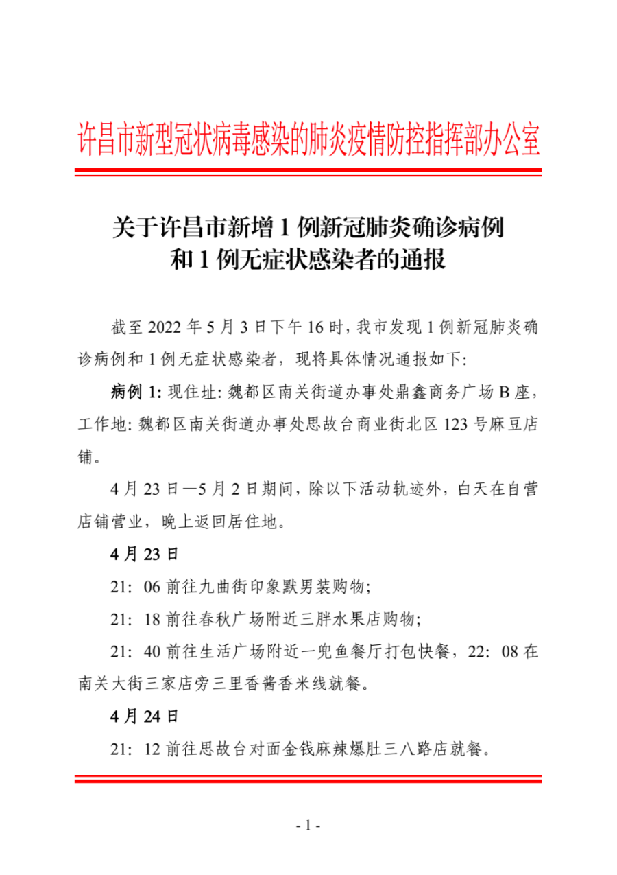 截至2022年5月3日16时,许昌市发现1例新冠肺炎确诊病例和1例无症状感染者,具体情况通报如下: