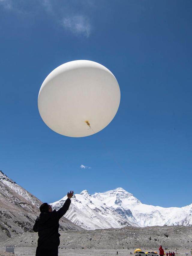 5月3日,在珠峰登山大本营,科研人员施放大气臭氧探空气球。