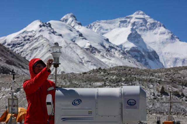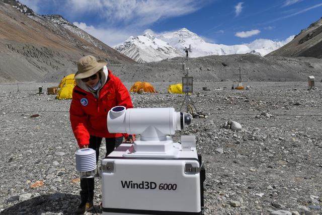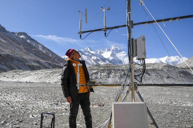 5月3日,在珠峰登山大本营,科研人员检查微波辐射计。