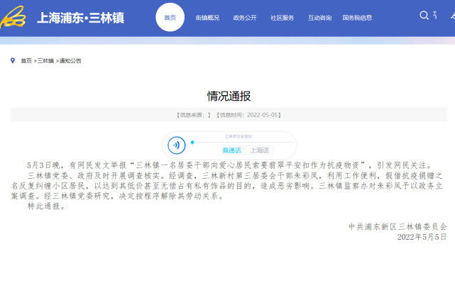三林镇党委、政府及时开展调查核实。经调查,三林新村第三居委会干部朱彩凤,利用工作便利,假借抗疫捐赠之名反复纠缠小区居民,以达到其低价甚至无偿占有私有饰品的目的,造成恶劣影响。三林镇监察办对朱彩凤予以政务立案调查。经三林镇党委研究,决定按程序解除其劳动关系。