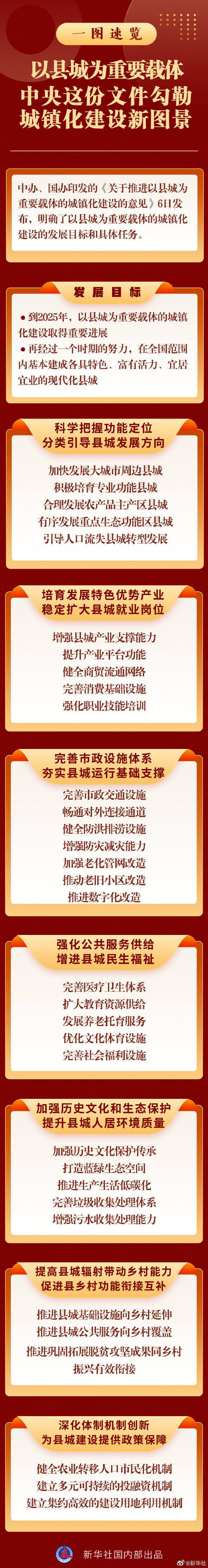 中办、国办印发的《关于推进以县城为重要载体的城镇化建设的意见》6日发布。以县城为重要载体的城镇化建设,发展目标是什么?又有哪些具体任务?快戳长图速览这份文件的要点吧!