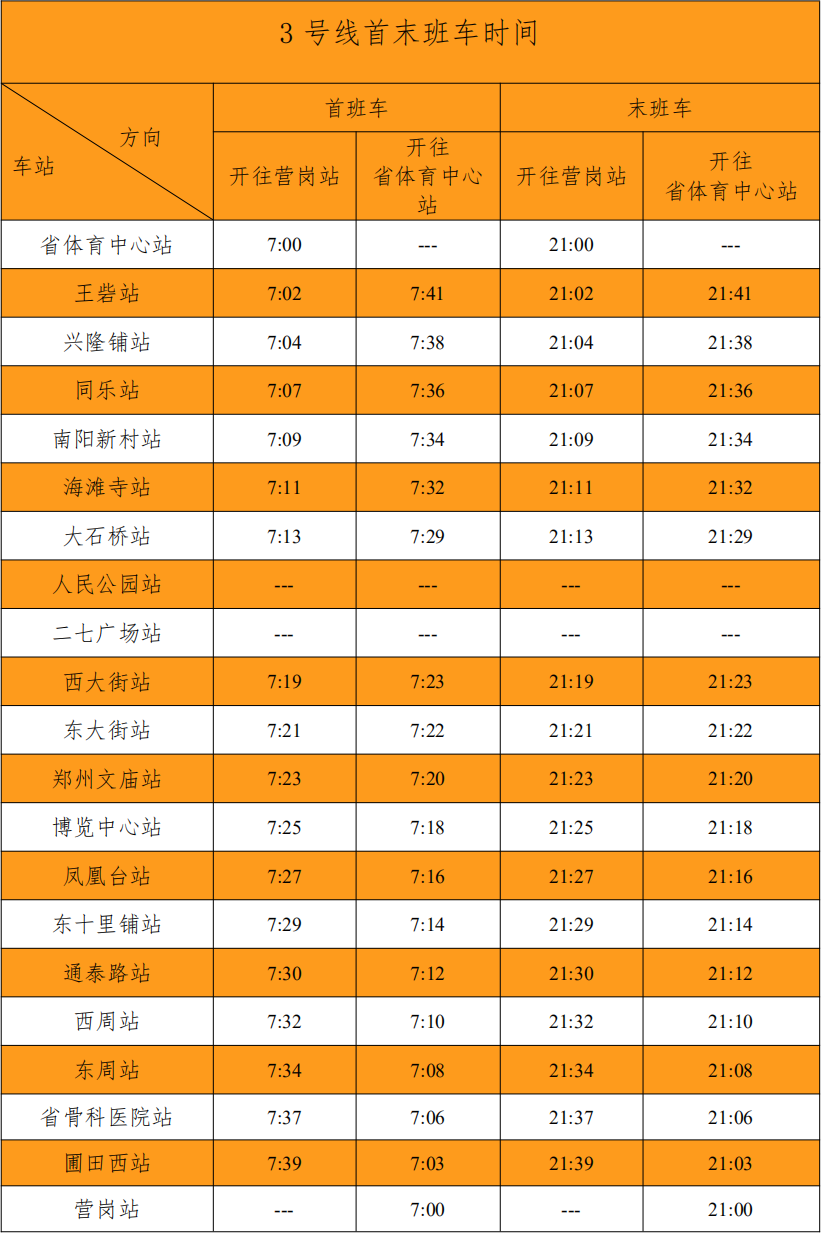 据郑州中建深铁3号线,为认真贯彻落实上级主管部门疫情防控要求,切实履行社会责任,有效阻断疫情传播,自2022年5月6日起,郑州中建深铁3号线运营时间为07:00-21:00,高峰时段(7:00~9:00,17:00~19:00)列车行车间隔维持30分钟,运营时间内除上述时间段外(9:00~17:00,19:00~21:00)行车间隔调整为60分钟。