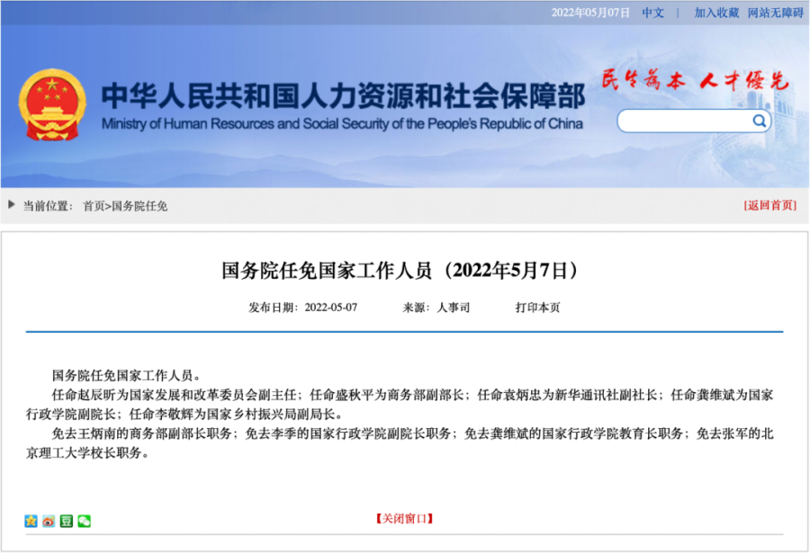 任命赵辰昕为国家发展和改革委员会副主任;任命盛秋平为商务部副部长;任命袁炳忠为新华通讯社副社长;任命龚维斌为国家行政学院副院长;任命李敬辉为国家乡村振兴局副局长。