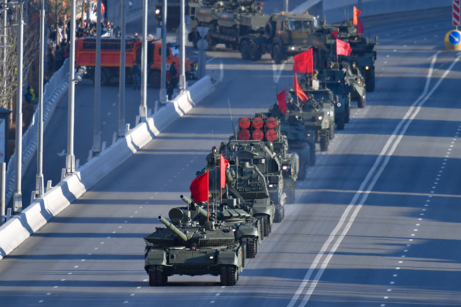 随后,俄军履带式、轮式装备和防空系统等主力武器装备相继通过红场,包括T-14“阿玛塔”、T-72B3M 、T-90M坦克,“台风-K”装甲车,“伊斯坎德尔-M”弹道导弹系统,“亚尔斯”洲际弹道导弹系统,“山毛榉-M3”、“道尔-M2”、S-400防空导弹系统和“天王星-9”战斗机器人等装备。